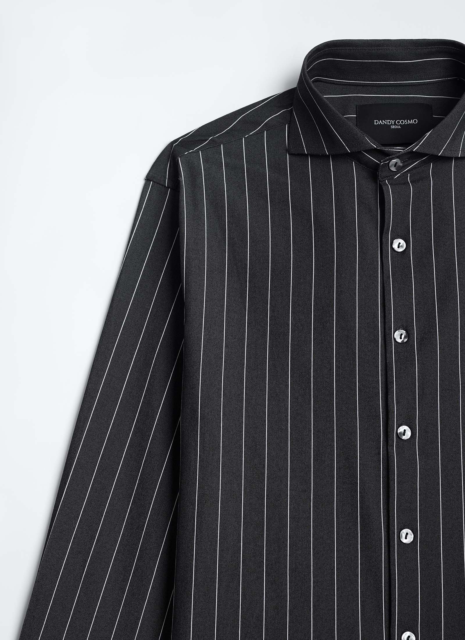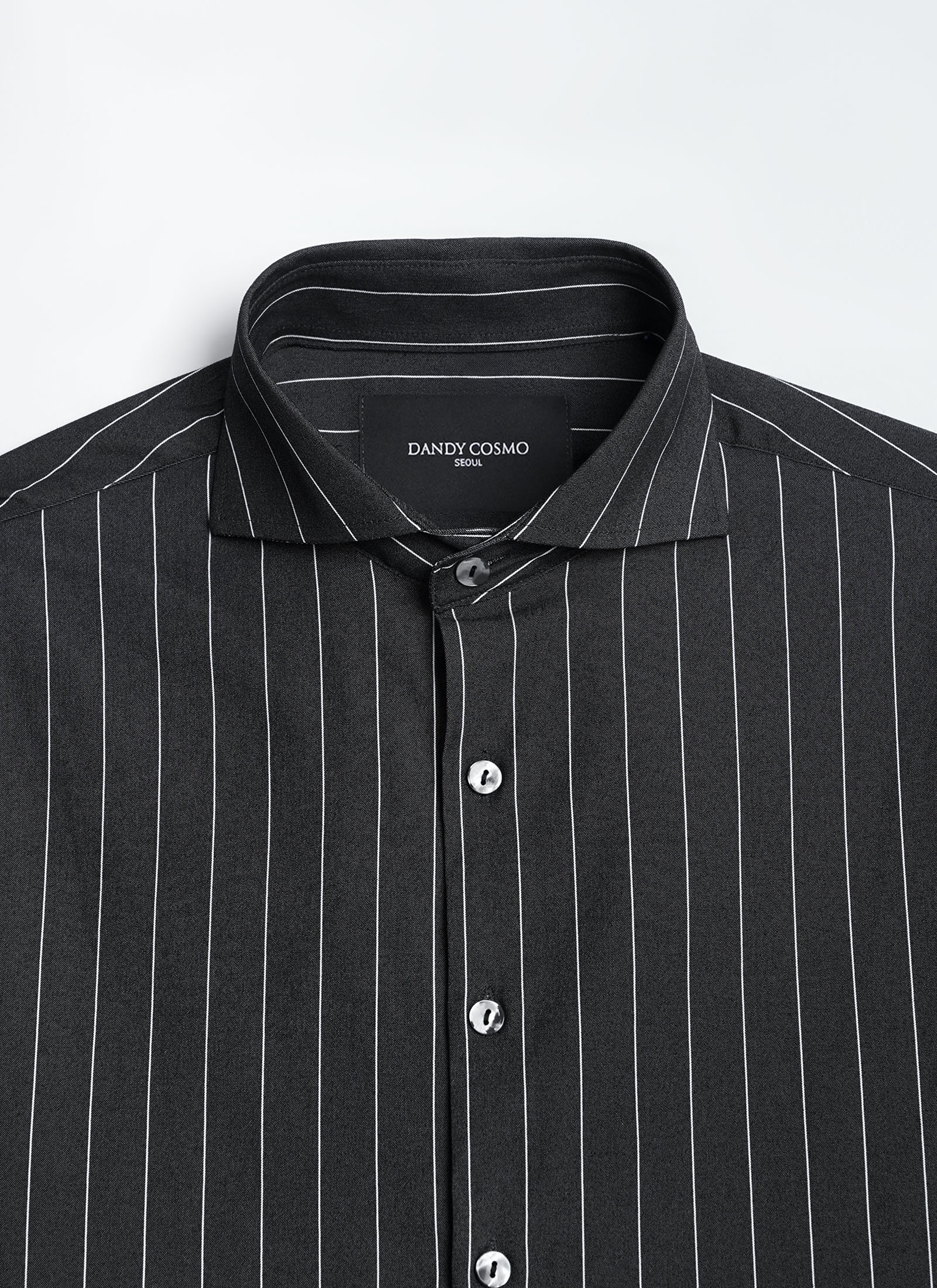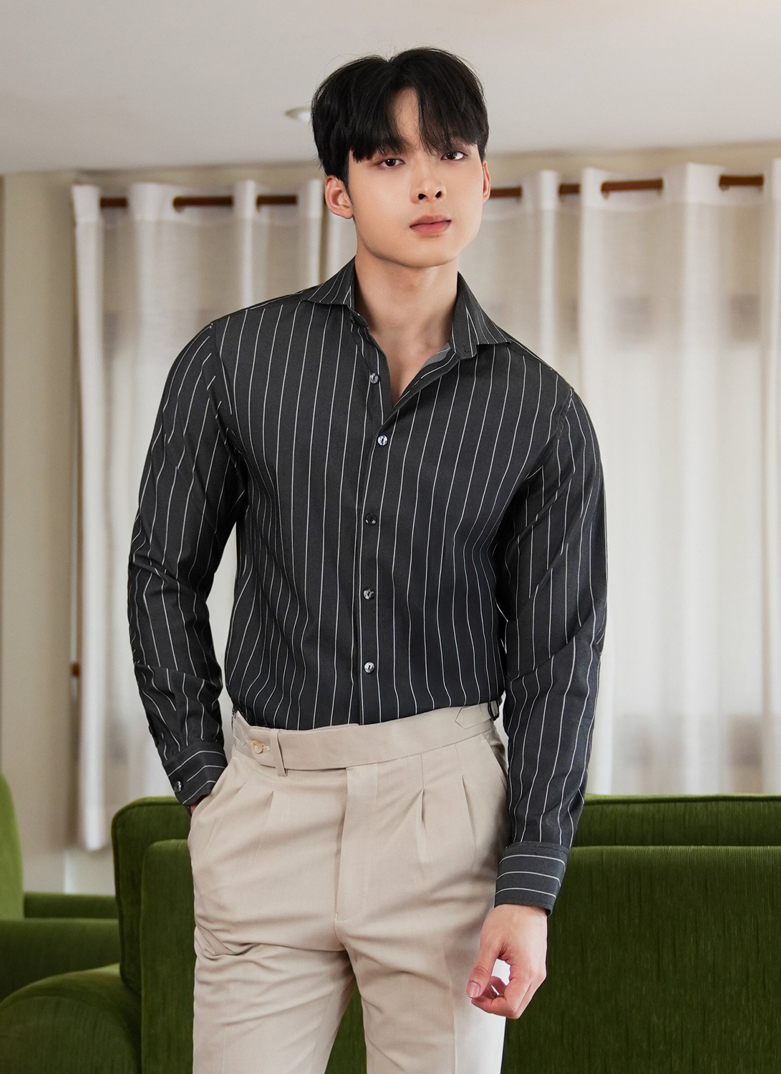 เสื้อเชิ้ตลายทางแนวตั้งตัดเส้นขาว คอเสื้อทรง Cutaway Collar ดีไซน์พิเศษที่เว้นช่องคอกว้างเล็กน้อย เพิ่มความคล่องตัวและเสน่ห์แบบ modern gentleman ทันสมัย เหมาะทั้งสำหรับวันทำงาน และใส่เที่ยวสไตล์ smart casual ที่ดูไม่ทางการจนเกินไป