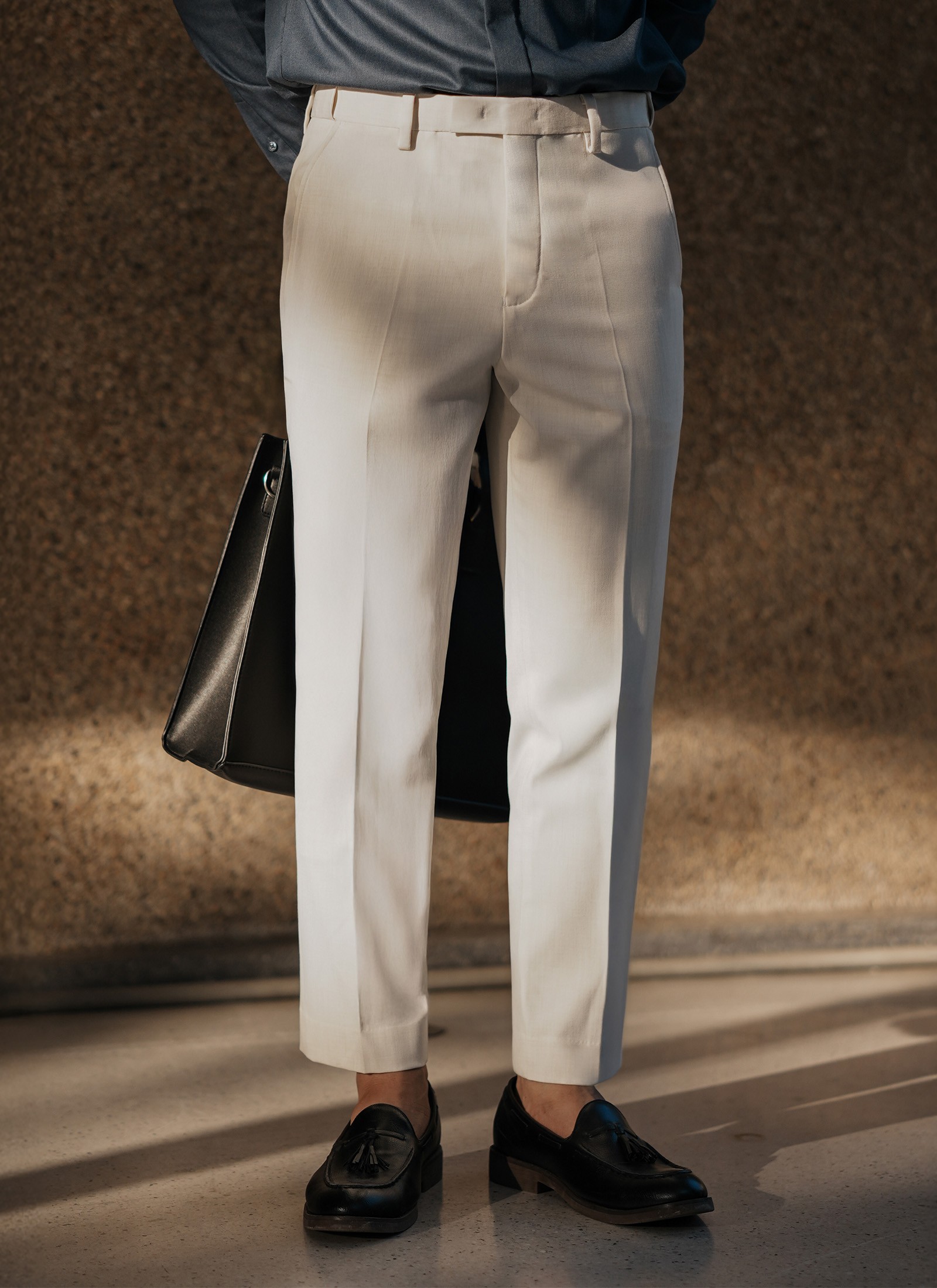 กางเกงถูกตัดเย็บด้วยเทคนิค ซ่อนฝีเข็ม (Invisible Stitching) เพื่อความเรียบเนียน ไร้รอยเย็บที่มองเห็นจากภายนอก ทั้งบริเวณขอบเอว/หูเข็มขัด สร้างลุคที่ดูเนี้ยบและหรูหราในทุกรายละเอียด