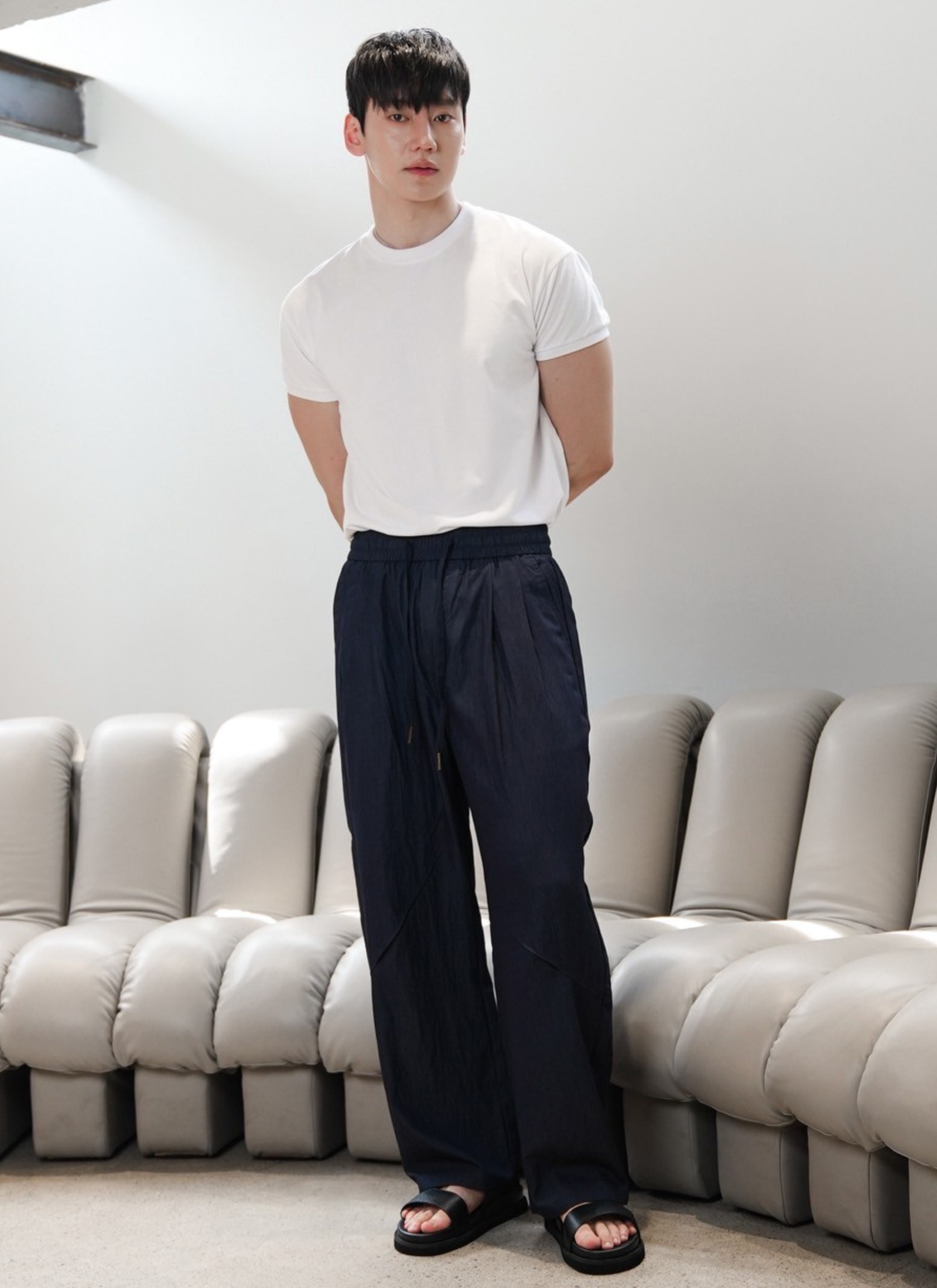 กางเกงขายาวทรงขาใหญ่ ดีไซน์เรียบ แต่ซ่อนลูกเล่นด้วยโครงทรงเนี้ยบ