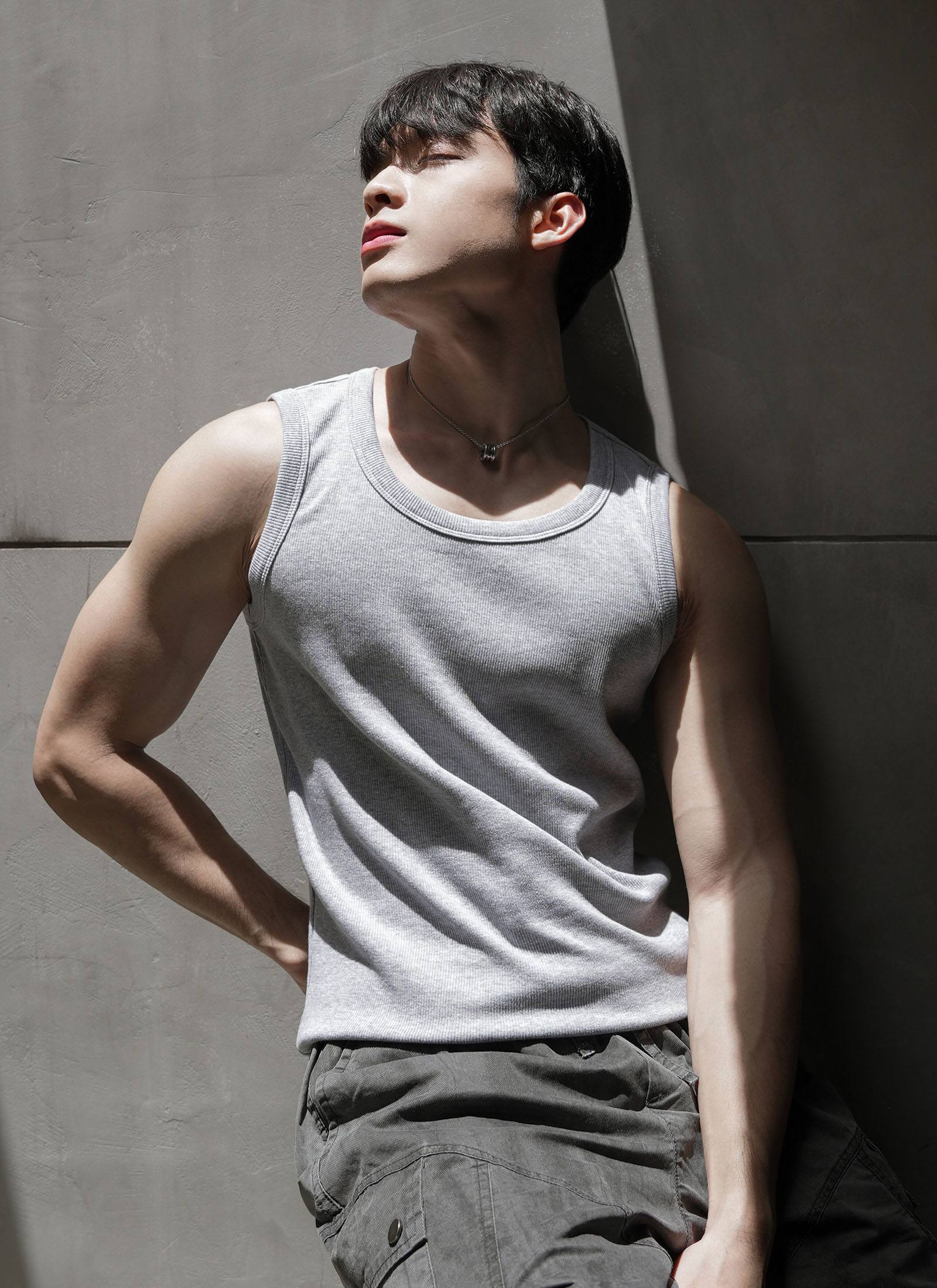 เสื้อกล้ามดีไซน์เรียบแต่คม โครงสร้างแพตเทิร์นถูกวางมาเพื่อ “เสริมช่วงอก-ไหล่” โดยเฉพาะ คอเว้าแต่พอดี ไม่กว้าง ไม่ลึกเกิน ช่วยโชว์ไหล่และช่วงอกให้ชัดขึ้น ตัวเสื้อเข้ารูปเบา ๆ แบบไม่รัดแน่น เพื่อให้รูปร่างดูสมส่วนโดยไม่ต้องมีกล้ามก็ใส่หล่อ ดีไซน์แบบ “GHOST FIT” — ใส่แล้วเหมือนหุ่นดีขึ้นแบบไม่รู้ตัว